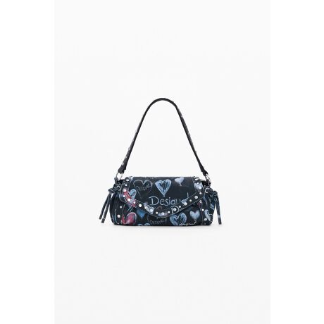 デニム風生地にグラフィティ風プリントが施されたミディアムサイズのショルダーバッグ、交換可能なハンドル、サイドのリボンディテール付き。