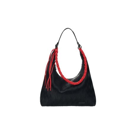 楕円形の形をした中型のフェイクレザーのバッグ、交換可能なストラップ、同じトーンのエンボス加工の線、黒のDesigualロゴのアクセント、カードホルダー付きの取り外し可能なチャームのディテール。