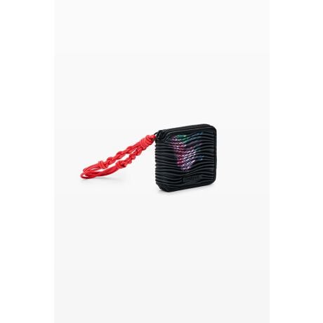 ロゴ付きタグと取り外し可能な編み込みハンドルを備えた、ストライプ模様のテクスチャ生地の中型財布。