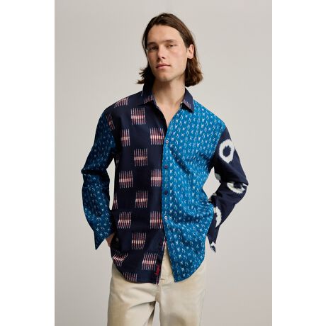 異なる柄で切り替えられた総柄プリントの長袖シャツ。ラペル付きシャツカラー。フロントボタン留めの100%コットン生地。織り生地と幾何学模様を組み合わせたデザイン。