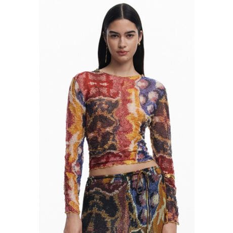 クリスチャン・ラクロワ氏がデザインしたエスニック柄のテクスチャ生地で作られた長袖ブラウス。