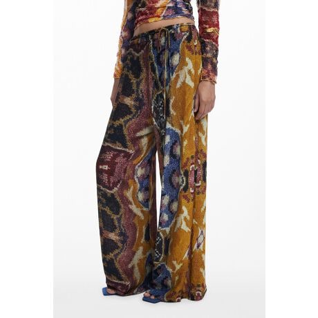 クリスチャン・ラクロワ氏がデザインした、エスニックスタイルのプリントが施された流れるような生地で仕立てられたパラッツォカットのパンツ