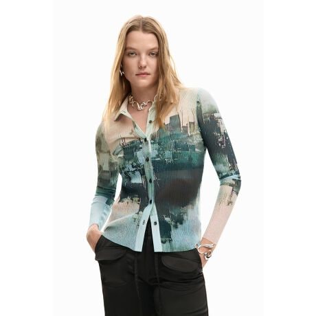 水彩画のような淡い写真風プリントとプリーツ加工のあるカットソー生地を使用した、ボタン付きのスリムシャツ。