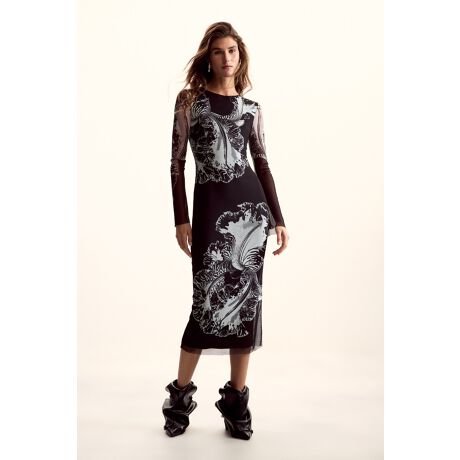 クリスチャン・ラクロワ(M. Christian Lacroix)によってデザインされた、チュール生地で仕立てられた裏地付きの抽象的なプリントのタイトなロングドレス。