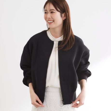 前開きは逆回のファスナー開きで、下側を開けてカーディガン風にもお召しいただけるライトブルゾン。