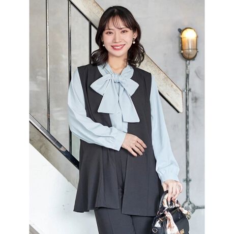 リボン結びをしたボウタイブラウスの上に重ねるとレディなムードがプラスされこなれた印象に仕上がるのでおすすめです。