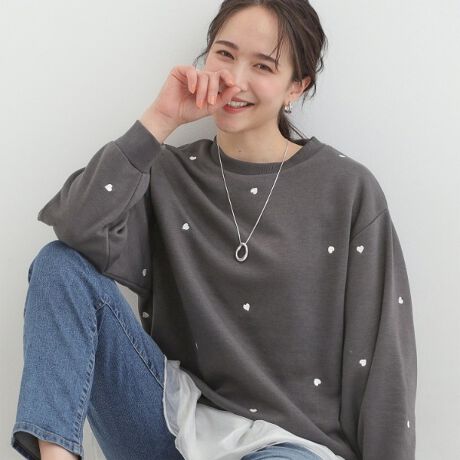 ハートの総柄と、落書きタッチの刺繍施された裏起毛スウェット。