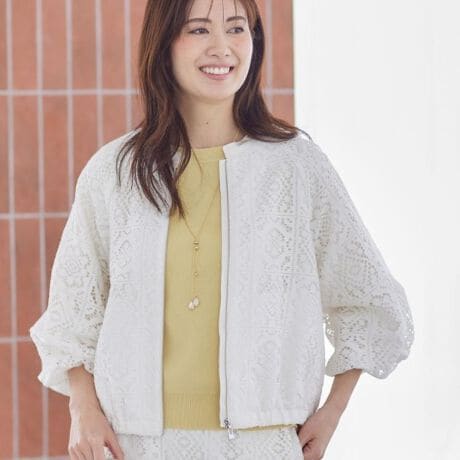 レース素材を取り入れたフェミニンさとカジュアル感を兼ね備えたジップアップショートブルゾン。