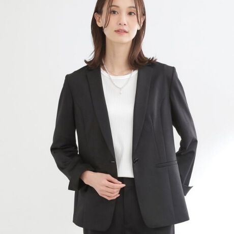 程よくシェイプされたウエストラインと縦の切り替えデザインがスタイルアップ効果を演出し、シャープなラペルとフロント1つボタン仕様できちんと感がありながらも軽やかな印象に見せてくくれます。