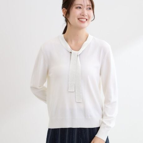 ボウタイデザインが上品で洗練されたムードを演出するハイゲージニットトップス。