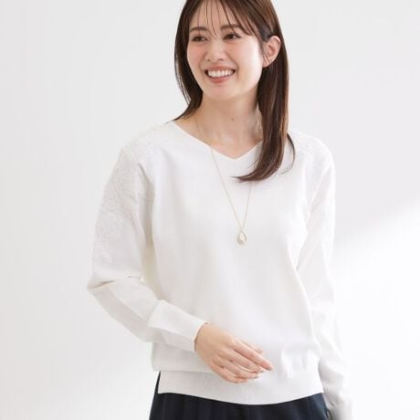 肩にレースを施したフェミニンで華やかなニットプルオーバー。