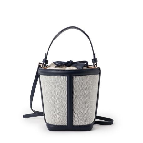 エルガリー生地(キャンバス調のしっかりしたファブリック)のナチュラルな雰囲気に、合成皮革のパイピングラインを組み合わせたバケット型ワンショルダーバッグ。