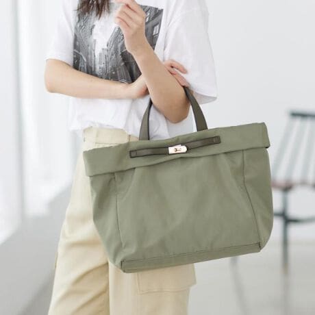 中央の金具が上品な表情を作るトートバッグ。