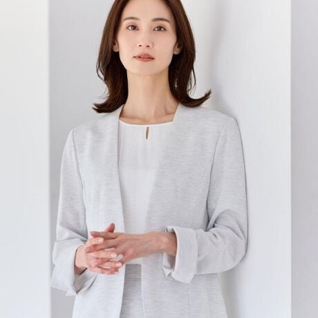 衿周りをコンパクトに仕上げることで顔周りがすっきり見え、インナーを選ばず着用いただけ、身頃にはパネルラインを入れウエスト位置をキレイに見せすっきりとしたシルエットにしています。