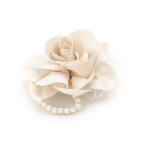 花の片側に配したパール調ビーズの飾りがさりげなく華やかさを添え、フォーマルな場面では華やかなアクセントになってくれます。