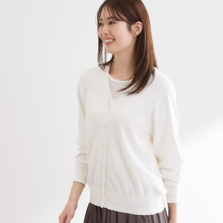 ハイゲージのすっきりとした表情が魅力のシンプルで着回し力のあるVネックカーディガン。