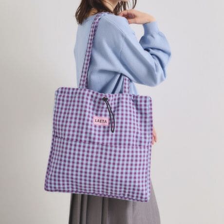 使いやすいスクエアシルエットで、開口部のドローストリングでギュッと絞ると丸みのあるフォルムに。