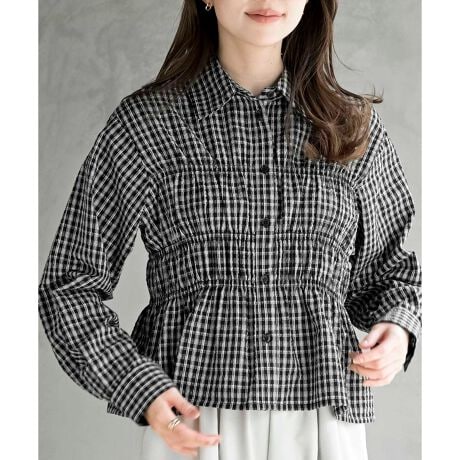 [型番:1430100165]☆2026/SS NEW☆クシュっとガーリーなシャーリングブラウス胸元をシャーリングで絞った女性らしいシャツブラウス。ひらひらとした裾がフェミニンな装いに仕上げてくれます。表面感のあるワッフル生地でさらりとした肌触り◎。かっちり襟できちんと感も演出してくれます。オンでもオフでも使えるトップス。裏地なし伸縮性なし薄手前開きボタン留め袖口ボタンあり洗濯:手洗い可
