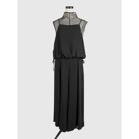 シアー素材を取り入れたレイヤード風キャミソールと、ワイドパンツのセットアップ。