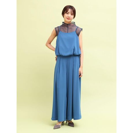 シアー素材を取り入れたレイヤード風キャミソールと、ワイドパンツのセットアップ。