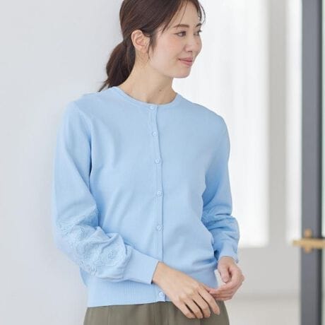 袖にレースをあしらい華やかさと上品さを兼ね備えたニットカーディガン。