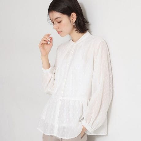 シフォンジャカード素材を比翼のバンドカラーで仕上げたブラウス。