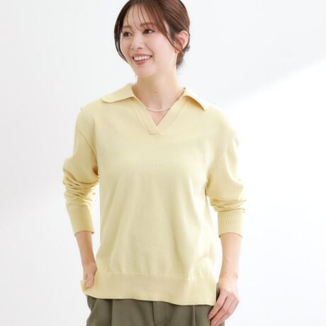 スキッパータイプの衿付きデザインで、お顔周りをすっきり見せてくれるニットプルオーバー。