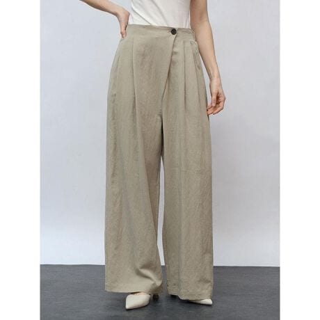 ラップ風のウエストデザインがこなれ感を与えるパンツ。ゆったりとしたシルエットがかしこまりすぎない上品なラフさを演出し、大人ムード漂う抜け感のある着こなしが叶います。ジャケットとセットで着用すればスタイリッシュなコーデに。シンプルなデザインでオンオフ着回しの効くワードローブに重宝したいアイテムです。