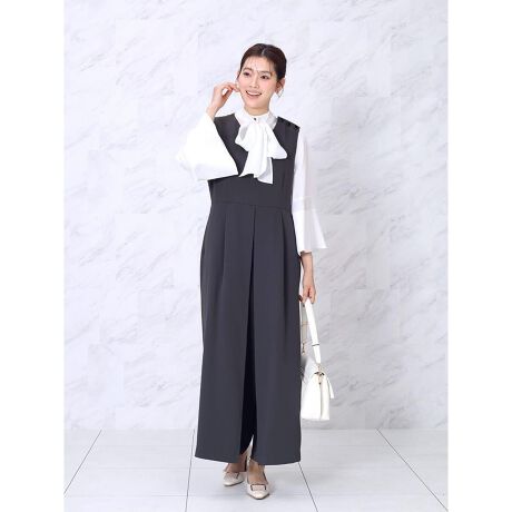 ウエスト切替を高めに設定することで視線を自然と上へ導き、品よくスタイルアップした印象を演出。