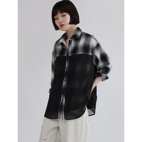 チェックシャツにシアー素材を重ねた、モード感と着映えを両立するレイヤードチェックシャツ。