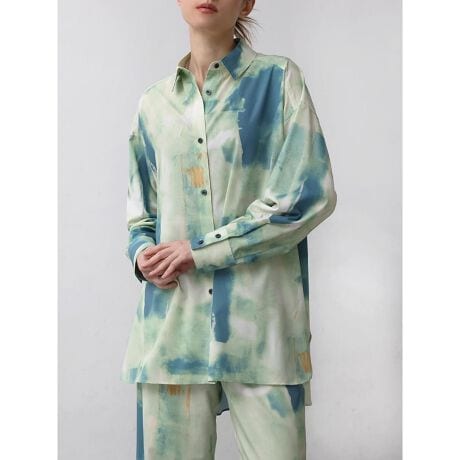 Agaオリジナルプリントを転写したニュアンス柄がトレンドライクなシャツ。まだらにペイントされた独特なデザインがエッジの効いた一品に。一着で周りと差がつき個性あふれるスタイルに目を惹くアイテム。レイヤードスタイルでワンポイントファッションとしても活躍します。