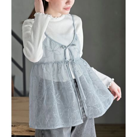 花柄刺繍前開きダブルリボンキャミチュニック