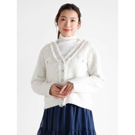 クラシックなツイードにゴールドのボタンが目を惹くジャケット。
