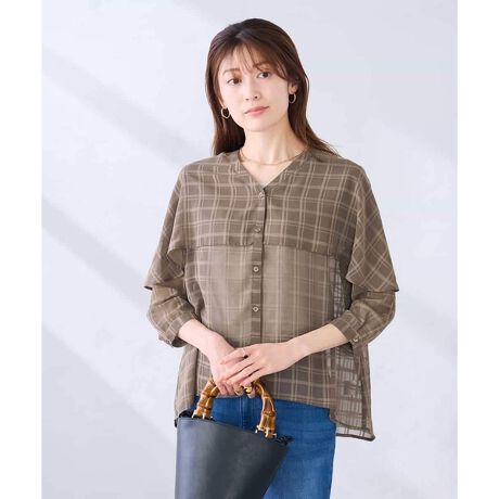 涼しげな印象のシアー素材のブラウスは、汎用性の高いネイビー無地と、鮮度あるブラウン系チェック柄の2色展開です。