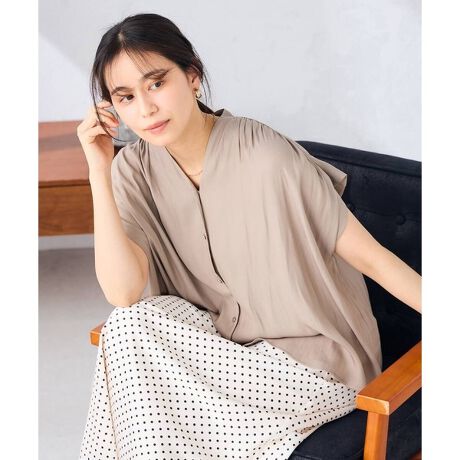 デイリーにも通勤にも使える上品な印象のギャザーサテンブラウスです。