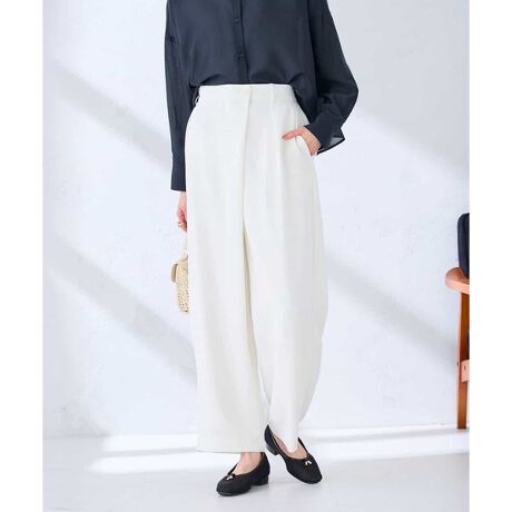 アシメデザインで深すぎないタックが入ったきれい目なワイドパンツ。