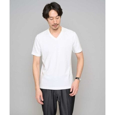 Vゾーンの開きを少し浅くすることで、1枚で着用した際にも首元の深さが気になりすぎず清潔感があり快適に着用できるのがポイント。