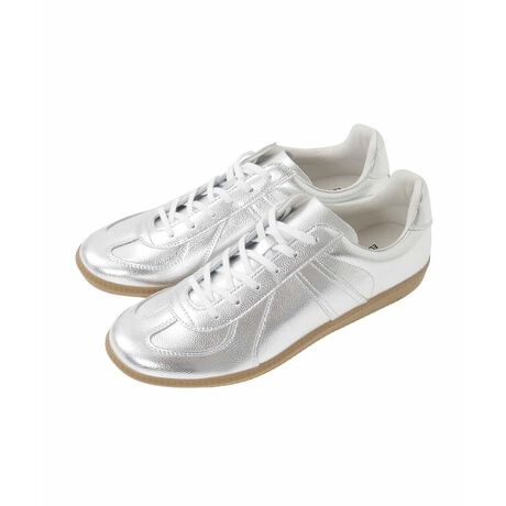 [型番:KT6GD57079]◆1970〜90年代頃にドイツ軍のトレーニングシューズとして使用されていたジャーマントレーナーをモチーフにしたスニーカー◆ すっきりしたフォルムとクッション性のあるソールで現代的にモディファイドしております。 シルバーメタリックでインパクトのあるアッパー素材を使用。 カジュアルスタイルからキレイ目スタイルの外しにまで対応できます。