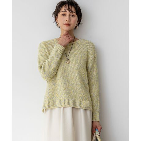 春らしい明るいミックスカラーが目を引く、イタリアインポートヤーンで編み立てたラウンドネックプルオーバーです。ややワイドなシルエットとクロップド丈が特徴で、ワイドパンツやスカートと合わせるだけで、バランスの取れた洗練された着こなしが完成します。サイドにはやや深めのスリットが入っており、インナーにシャツやTシャツなどを重ね着するレイヤードスタイルもおすすめです。コットンの柔らかな風合いと軽やかなカラーリングが、着る人の気分まで華やかに彩り、コーディネートに存在感をプラスします。休日のカジュアルスタイルや、友人とのランチなど、幅広いシーンで活躍する一枚です。カラーは、砂浜のような温かみのあるサンドミックス(#533)、明るく陽気な印象のイエローミックス(#542)、柔らかなオレンジがかったピンク系が魅力のアプリコットミックス(#512)、空のように爽やかなサックスミックス(#572)の4色展開です。