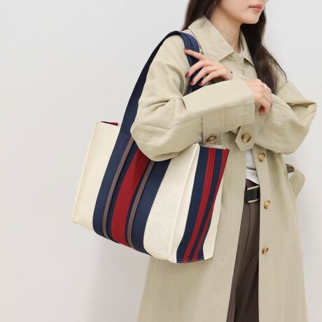 ・涼しげなメッシュと立体的な表情を持つストライプ柄を大胆に組み合わせたトートバッグ