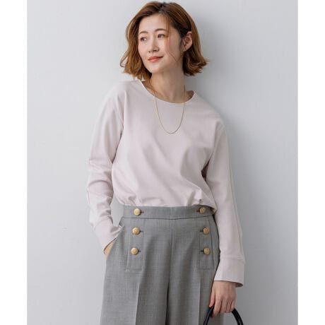 シンプルなフロントデザインに、後ろに配されたゴールドのボタンが目を惹くTEEブラウスです。合わせやすいクルーネックは、どんなスタイリングにも馴染み、洗練された印象を与えます。手首を美しく見せるカフスデザインが、さりげない華やかさをプラス。オフィスでのきれいめスタイルから、休日のカジュアルダウンまで、幅広いシーンで上品な着こなしを叶えます。カラーは、クリーンな印象のホワイト(#001)、柔らかな女性らしさを引き立てるピンク(#012)、知的で落ち着いたネイビー(#075)の3色展開です。
