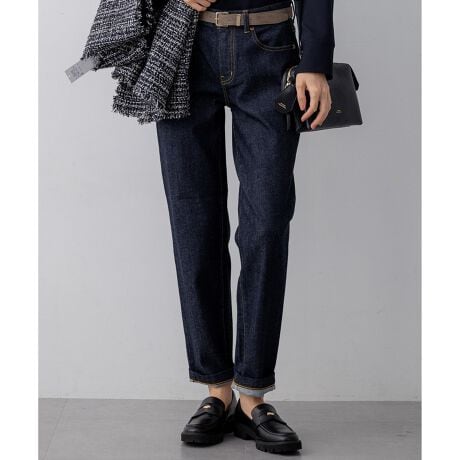 23区定番のストレッチデニムを使用しており、動きやすくストレスフリーな穿き心地を実現しています。伸びすぎない快適なストレッチ性が魅力です。表面の凹凸感を抑え、クリーンな表情に仕上げています。さらに、通常のデニムよりも色落ちしにくい加工を施しているため、美しい色合いを長くお楽しみいただけます。