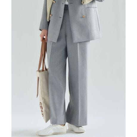 フロントに配されたゴールドボタンがアクセントになった、マニッシュな雰囲気漂うマリンテイストなパンツです。センタープレスが施されたワイドシルエットは、すっきりとスマートな印象。サイドファスナー仕様で着脱しやすく、ウエスト後ろはゴムギャザーでストレスフリーな穿き心地を実現しました。ニットカーディガンと合わせた上品な着こなしはもちろん、ブラウスでオフィスシーンに、Tシャツでカジュアルにと幅広いスタイリングをお楽しみいただけます。 カラーは、深みのある上品なネイビー(#075)と、洗練された印象を与える明るいライトグレー(#003)の2色展開です。