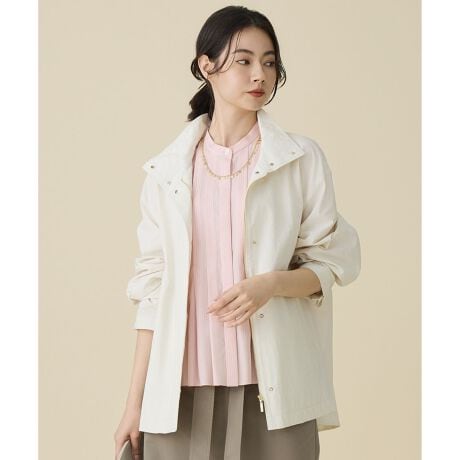 アレンジも調節も自由に楽しめる、デイリーに寄り添うブルゾン■デザインフード付きのスタンドカラーブルゾンです。フードは取り外し可能で、スタンドカラーのアウターとしても着用いただけます。前後差をつけた着丈はヒップ周りをほどよくカバーし、すっきりとした印象です。さらに、ウエストのドローストリングを絞ることでシルエット調整ができ、パンツ・スカート・ワンピースなど幅広いアイテムと相性良くコーディネートしていただけます。程よい肉感の素材を使用しているため、季節の変わり目に活躍するアイテムです。■素材繊細な綿の横畝の表情が特徴のタッサー素材です。綿ならではの天然素材のタッチと、ナイロンの特徴である軽さとしなやかさを併せ持った風合いで、見た目よりも軽い素材です。撥水加工を施しております。■同素材アイテムスタンドカラーコート(CMWMLS0201)ブルゾン(JKWMGM0201)