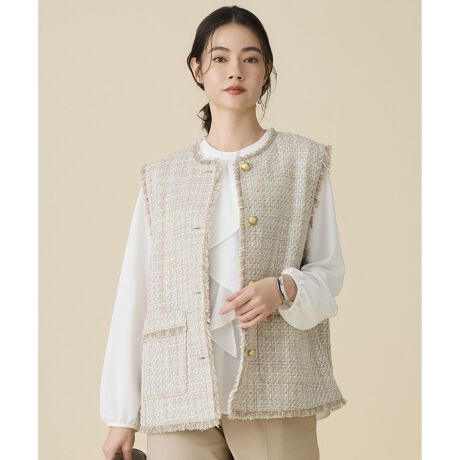 きれいめカラーで華やかなファンシーノットツイードジレ■デザイン合わせやすいきれいめカラーに華やかなツイード素材を用いたベストです。オケージョン向けのベストより着丈をやや短くすることで、普段使いにも取り入れやすいデザインにしています。裾回りを少し多めに取ることで、インナーを選ばずリラックスした着こなしが可能です。また、パンツにもスカートにも合わせやすい汎用性のあるバランスになっています。お出かけやイベントスタイルにもおすすめです。■素材ベージュは、多種類のファンシーヤーンを使用しながらも、見た目以上に軽く通気性の良い素材に仕上げています。ベースにほどよい表情を持たせ、オリジナルのラメ入りリボン糸で繊細な華やかさをさりげなくプラスしています。さらに、明るめの多色ノットを加えることで、全体の印象を明るく華やかにし、エレガントな雰囲気に仕上げています。軽さを保つために、変形メッシュ(プロペラ)組織を採用し、目付を調整しています。ブルーも同様に、多種類のファンシーヤーンを使用し、見た目以上に軽く通気性の良い素材に仕上げています。スラブ杢の表情をベースに、オリジナルのラメ入りリボン糸で繊細な華やかさをプラスしています。控えめな多色ノットを加えることで、全体の印象を上品に引き立てています。軽さを保つため、こちらも変形メッシュ(プロペラ)組織を採用し、目付を調整しています。■同素材ジャケット(JKW7LS0203)