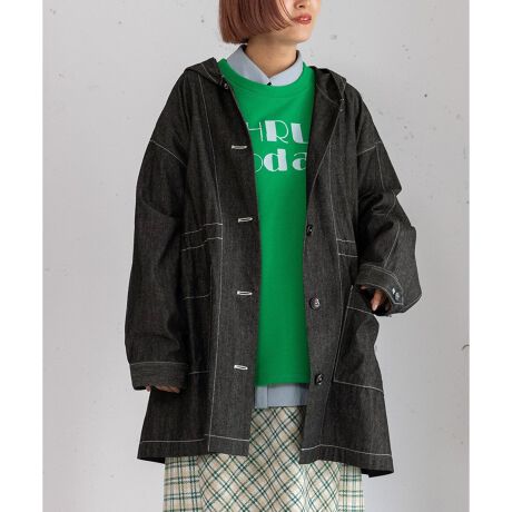 オーバーサイズでボリューム感のあるシルエットが魅力のジャケット。ファスナーの開閉でフードとセーラーカラーに変化する、遊び心のある衿デザインがポイントです。ミドル丈でボトムを選ばず着用でき、ウエスト裏側の紐でシルエットの調整も可能。たっぷりとした袖幅は、袖口のボタンでフィット感を変えられます。ステッチとボタンを配色にして、さりげなくデザインのアクセントにしました。