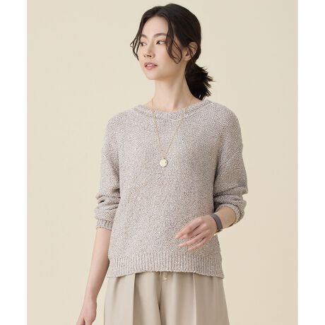 シンプルに纏っても華やかに決まる大人のデザインニット■デザイン程よいラメとスパンコールで1枚でも着映えする、華やかな印象のミドルゲージファンシーニットです。アームホールまわりにはゆとりを持たせつつ、腰まわりはすっきりとコンパクトに仕上げたシルエットが特徴です。リラクシーな着心地でありながら、コートインでもかさばらずに着られるバランスのよいサイズ感です。様々なボトムスにあわせて頂けます。■素材ノットラメや印象的な少し大きめのスパンコールをミックスしたミドルゲージファンシーヤーンです。ベース素材も上品な光沢感のあるポリエステルを使用し、程よいドレープ感が大人っぽい印象にしあげています。