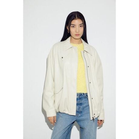 ■フェイクレザーミドルブルゾン■ポイントハードになりすぎず、女性らしいモードな印象に仕上げたミドル丈のフェイクレザーコートです。■ディテールフロントは逆開ファスナー仕様なので、スタイリングに抜け感をプラスしたりシルエットの変化を楽しめます。■スタイリングヒップが隠れる着丈と、ややオーバーなサイジングで、カジュアルからモードまで幅広いスタイリングで活躍します。■生地程よくシボ感のあるマットな質感のフェイクレザーを使用し、光沢を抑えたシックな表情が特徴です。透け感:なし裏 地:あり伸縮性:なし光沢感:なし[注意事項]※画像の商品はサンプルです。実際の商品と仕様、加工が若干異なる場合があります。※画像の商品は光の照射や角度、お使いのモニター環境により、実物と色味が異なる場合がございます。※着用、お取り扱いの際は、アテンションタグをご確認ください。