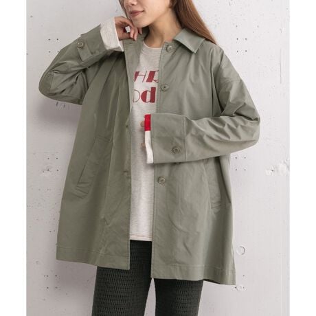 コットンナイロンの軽いツイル素材で仕立てたステンカラーコート。微光沢のある素材感が、カジュアルなコーディネートをさりげなくアップデートしてくれます。ヒップが隠れるミドル丈で、きれいなAラインシルエットに仕上げました。台衿部分と袖口裏には配色をあしらい、ちらりと見えたときのアクセントに。袖口は広めの作りで、ベルトでシルエットの調整も可能です。