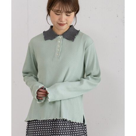 配色の衿がポイントのプルオーバートップス。衿端・袖口・裾はメロー始末で軽やかに仕上げ、並んだボタンがさりげないアクセントになっています。無地は柔らかな肌触りで伸縮性のあるリブ素材、ボーダーは程よい厚みのフライス生地を使用。1枚着としてはもちろん、レイヤードのインナーとしても活躍する、普段使いしやすいアイテムです。